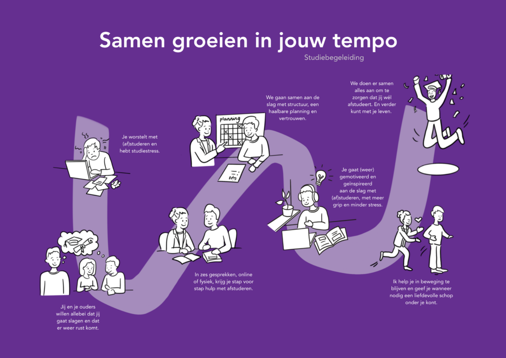 Je bent niet de enige! En je hoeft het niet alleen te doen! Met persoonlijke studiebegeleiding help ik, Yvonne van Gog van ConnectY je stap voor stap verder. En mocht je nog niet aan afstuderen toe zijn of geen hbo maar een mbo volgen? Ook dan help ik je graag. Samen vinden we je motivatie voor je studie, maken een planning en kijken we wat jij nodig hebt om wél weer met die studie bezig te zijn.